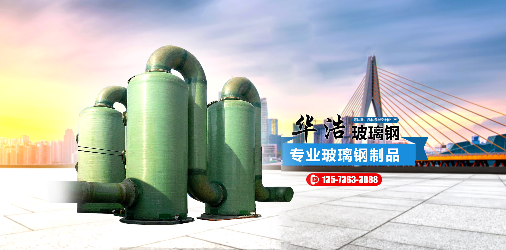 山東華浩玻璃鋼有限公司,位于世界風(fēng)箏都濰坊市南三十公里處,是生產(chǎn)各種玻璃鋼制品的專業(yè)公司。   華浩玻璃鋼生產(chǎn)各種立式、臥式玻璃鋼罐、玻璃鋼儲(chǔ)罐、玻璃鋼運(yùn)輸罐、標(biāo)準(zhǔn)運(yùn)輸罐、玻璃鋼鹽酸罐、化學(xué)反應(yīng)罐、真空壓力罐、設(shè)備罐、復(fù)合罐、玻璃鋼儲(chǔ)槽、大型玻璃鋼容器;玻璃鋼化糞池;各種型號(hào)的橫流式、逆流式(圓形、方形)玻璃鋼冷卻塔;機(jī)械纏繞玻璃鋼管道、管件、壓力管道,有機(jī)、無(wú)機(jī)通風(fēng)管道、空調(diào)管道;漂液洗鼓、耐腐耐高溫反應(yīng)釜、印染布車、組合式玻璃鋼水箱、玻璃鋼風(fēng)機(jī)、玻璃鋼不定型工藝品等二百多個(gè)品種。